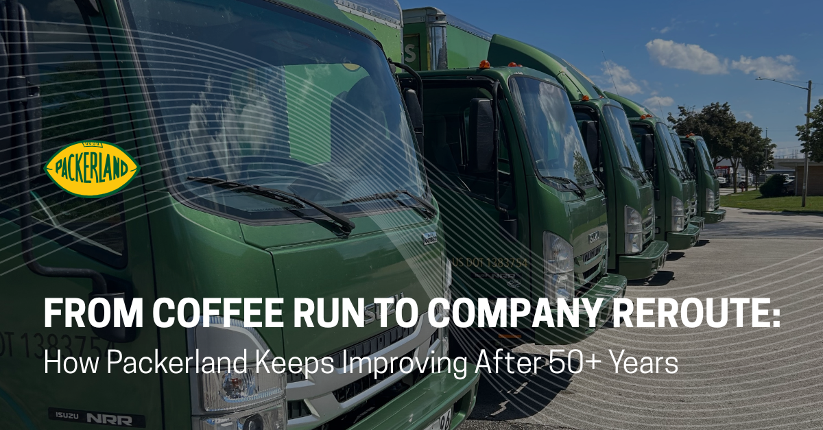 While stopping for coffee about 30 minutes north of our plant in Butler, Wisconsin, our General Manager, Katelyn Schultz, noticed two Packerland trucks delivering directly across the street from one another. Two trucks. Same area. Same time.